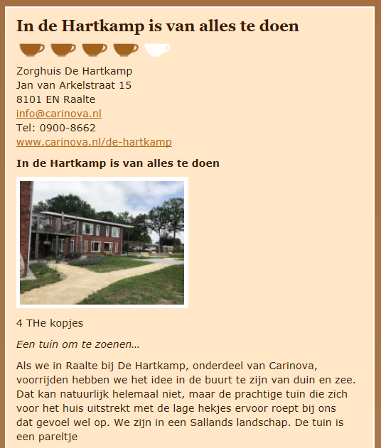 Zorgvisite.nl bezoekt verpleeg- en verzorgingshuizen en schrijft daar recensies over. Een bezoek aan de Hartkamp heeft een mooi recensie opgeleverd en is gepubliceerd onder de titel "In de Hartkamp is van alles te doen".